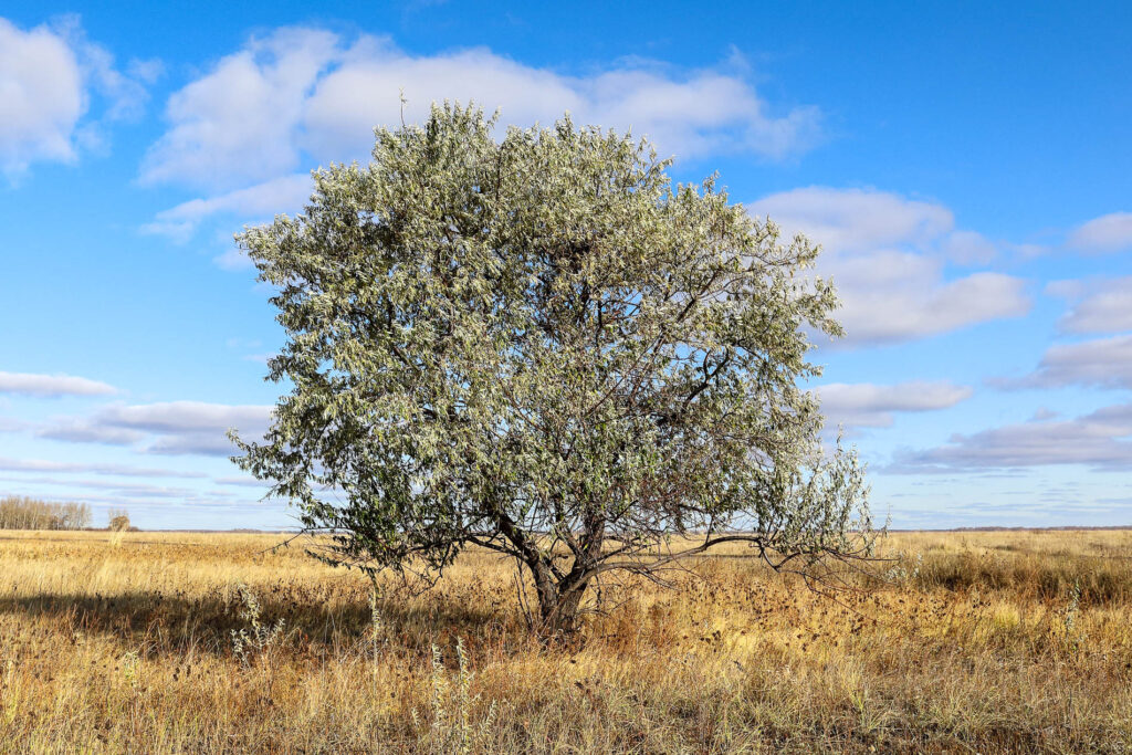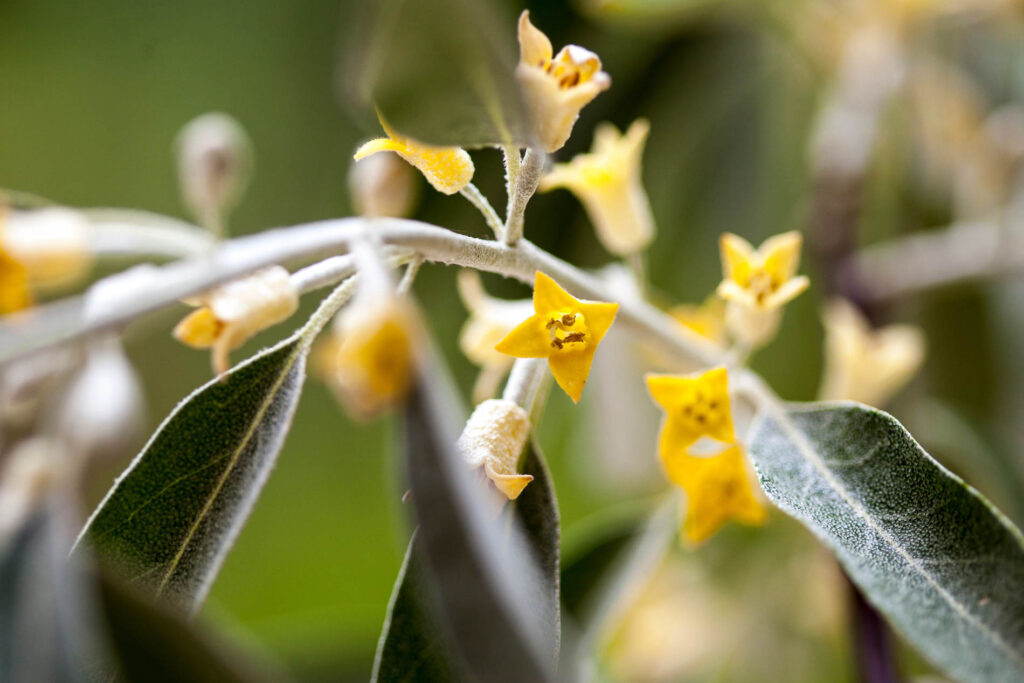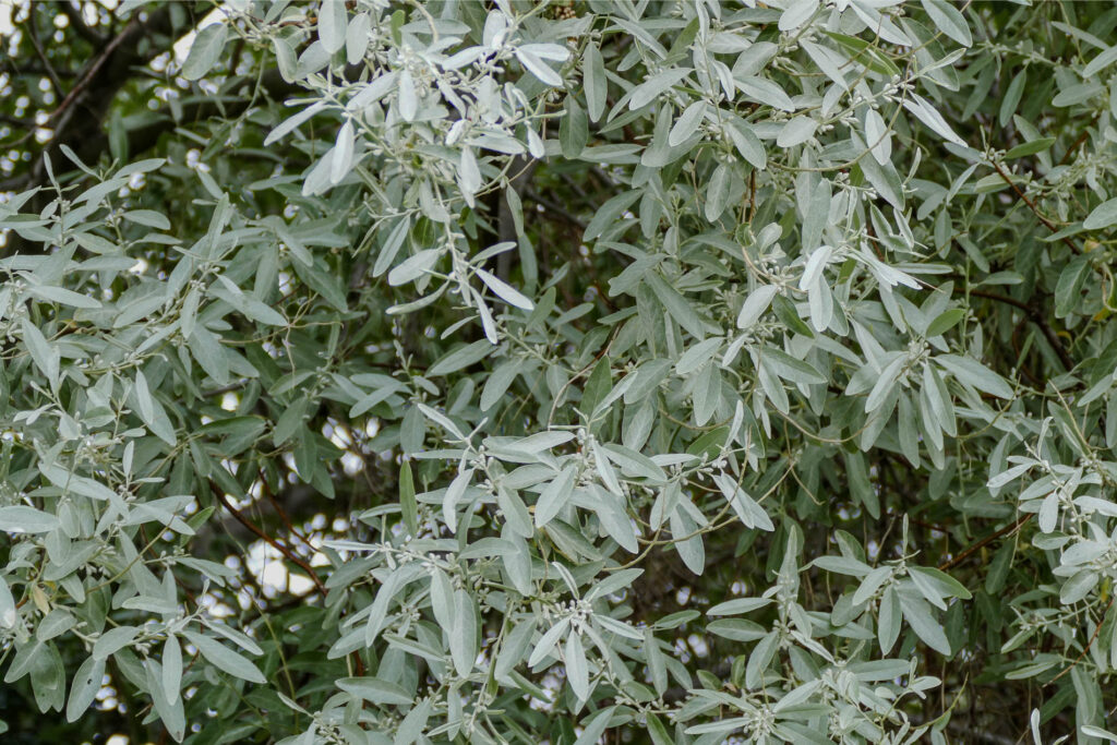 Elaeagnus angustifolia shares many visual traits with both olive and sea buckthorn with narrow silvery leaves and a greyish canopy, but differs in its flowers. Unlike sea buckthorn, it produces small yellowish flowers that are often strongly and pleasantly scented.